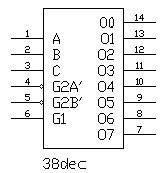 G1,G2A',G2B' – входи дозволу. Якщо сигнал на вході G1 високий та сигнали G2A i G2B низькі то декодер працює в його нормальному режимі. Якщо G1 – низький логічний сигнал або G2A i G2B – високий, то на усіх виходах існує сигнал логічної одиниці.