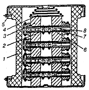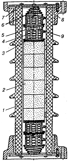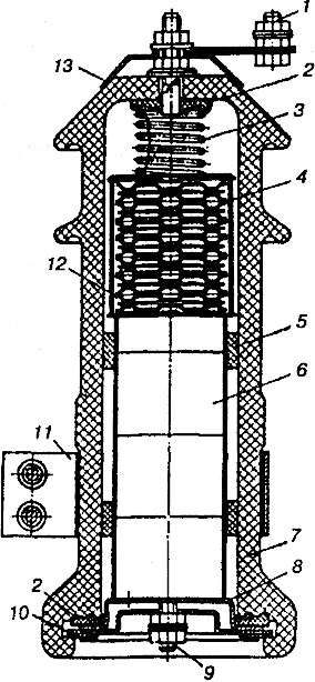 Разрядники являются защитными аппаратами. Они предназначены для защиты изоляции электрооборудования от перенапряжений. В распределительных устройствах электроустановок применяются вентильные разрядники, на линиях электропередачи — трубчатые. Вентильные разрядники состоят из искровых промежутков, включенных последовательно с рабочим резистором, имеющим нелинейную вольт-амперную характеристику. В некоторых разрядниках параллельно искровым промежуткам присоединяют шунтирующие резисторы для равномерного распределения напряжения между ними. В условных обозначениях разрядников буквы означают: Р — разрядник; В — вентильный, П — подстанционный (поляризованный для разрядников постоянного тока); С — станционный; М — с магнитным дутьем; О — облегченной конструкции; У — униполярный; К — для ограничения коммутационных перенапряжений. Цифры, следующие за буквами в обозначении, означают напряжения разрядника. Разрядники характеризуются рядом параметров. Класс напряжения разрядника — номинальное значение напряжения сети, для работы в которой разрядник предназначен. Наибольшее допустимое напряжение разрядника — эффективное значение наибольшего гарантированного заводом-изготовителем напряжения, при котором разрядник надежно гасит дугу. Пробивное напряжение разрядника— наибольшая величина плавно нарастающего напряжения в момент пробоя разрядника. Импульсное пробивное напряжение разрядника — наибольшая величина импульсного напряжения в момент пробоя разрядника при заданном значении предразрядного времени. Предразрядное время — время от начала нарастания импульсного напряжения до момента пробоя разрядника. Номинальный разрядный ток разрядника — амплитудное значение импульсного тока, который проходит через разрядник после его пробоя. Ток проводимости разрядника, искровые промежутки которого шунтированы резисторами, — ток, проходящий через разрядник при приложении к нему напряжения постоянного тока заданной величины. У разрядников, не имеющих шунтирующих резисторов, измеряемый при этом ток называется током утечки. Вентильные разрядники переменного тока служат основным средством ограничения перенапряжений и защиты от них. Разрядник РВП-6 показан на рис. 1. Он состоит из многократных искровых промежутков 12 и последовательно включенных нелинейных вилитовых резисторов б, размещенных в фарфоровом корпусе 7 и сжатых спиральной пружиной 3. Блок многократных искровых промежутков включает несколько последовательно соединенных единичных искровых промежутков, помещенных в бумажно-бакслитовый цилиндр 4. Единичный искровой промежуток состоит из двух фигурных латунных электродов, приклеенных к изоляционной меканитовой или электрокартонной прокладке. Нелинейный последовательный резистор набирается из вилитовых (вилит-запеченная смесь карборунда с жидким стеклом), обладающих вентильными свойствами, то есть сопротивление карборунда изменяется в зависимости от приложенного к нему напряжения: чем выше приложенное напряжение, тем ниже его сопротивление, и наоборот. Количество искровых промежутков в блоке и вилитовых дисков в колонке зависит от величины номинального напряжения разрядника. Плоскости, которыми соприкасаются диски, для лучшего контакта металлизируют алюминием, а боковые поверхности ви