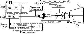ложительно заряженных анодов (А1 и А2) устремляются в направлении экрана (Э). На анод А2 подаётся положительное относительно катода напряжение порядка 800 3000 В, а на анод А1 от 20 до 50 % этой величины. Конфигурация электродов, их взаимное расположение и напряжения на анодах выбирают так, чтобы электрическое поле ускоряло и фокусировало поток электронов (ПЭ). Фокусировка осуществляется изменением напряжения на аноде A1, а яркость изменением напряжения на сетке (С), отрицательного по отношению к катоду.