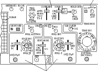 а) если её вытянуть на себя, то чувствительность будет увеличена в 5 раз; если, например, переключатель установлен в положение 5 мВ/дел., то при вытянутой ручке значение KО,Yстановится 1 мВ/дел. Этот режим обозначенPULL×5 под переключателем масштаба (pull– тянуть, ×5 – увеличение чувствительности в 5 раз).
