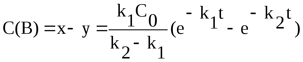 концентрация вещества B проходит через максимум, время достижения этого максимума определяется соотношением констант k1 и k2 и не зависит от концентрации С0 вещества А; скорость изменения концентрации вещества B сначала уменьшается до нуля, затем скорость его превращения сначала возрастает, а затем постепенно уменьшается;
