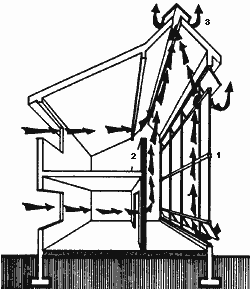 3.Оригинальное архитектурное решение пассивной системы теплохладоснабжения было применено в доме Д.Балкомба (Санта-фе, Нью-Мексико). На рис. 3 показан принцип работы этой системы в режиме охлаждения. Летом наружный воздух движется вследствие естественной тяги, охлаждаясь перед поступлением в дом при прохождении подземного канала и нагреваясь при отводе теплоты от внутренних поверхностей дома. Удаление нагретого воздуха осуществляется из верхней точки дома через трубу с жалюзи с северной стороны. Отопление дома обеспечивается с помощью пристроенной гелиотеплицы и масляных радиаторов. Движение воздуха в доме зимой и летом регулируется с помощью клапанов.