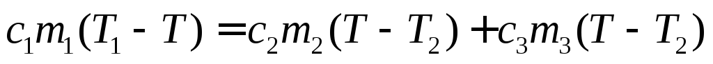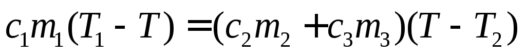 Нагреем твердое тело и опустим его в воду, налитую в калориметр. Твердое тело будет остывать, отдавая некоторое количества теплоты Q1 стаканчику калориметра и воде, которые, в свою очередь, получают от нагретого тела количество теплоты Q2 и Q3, нагреваясь при этом. В результате, в термодинамической системе «калориметр – вода - твердое тело» устанавливается состояние термодинамического равновесия при некоторой равновесной температуре T. Тогда уравнение теплового баланса для системы примет вид: