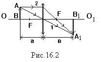 При построении изображения в собирающей линзе (Рис.16.2) необходимо придерживаться следующего плана построения: