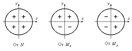 Знак перед каждым из слагаемых в формуле (12.2) выбираем такой, какой бы имело нормальное напряжение для каждого из соответствующих простых видов деформации, т.е. из физических соображений. В качестве примера покажем знаки, которые бы имело нормальное напряжение в каждой из четвертей координат для случая, приведенного на рис.12.1 от каждого из простых видов деформации (Рис.12.2).
