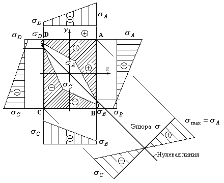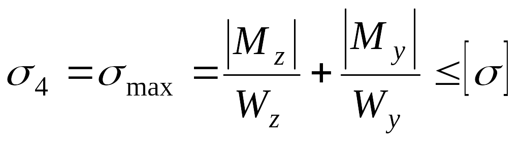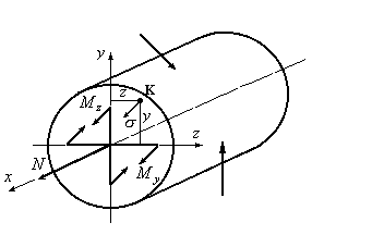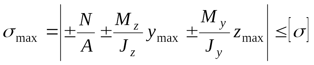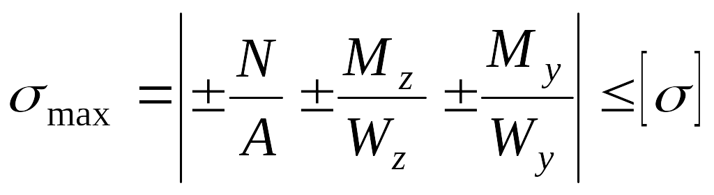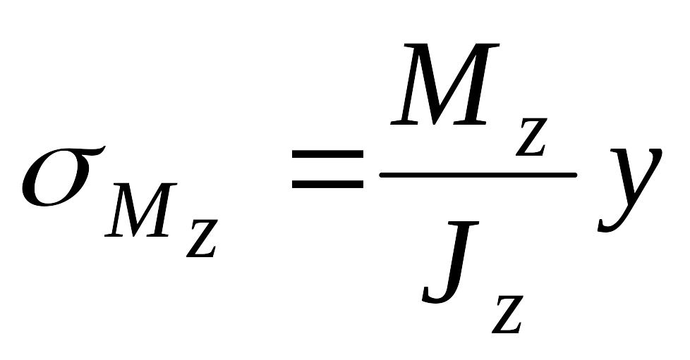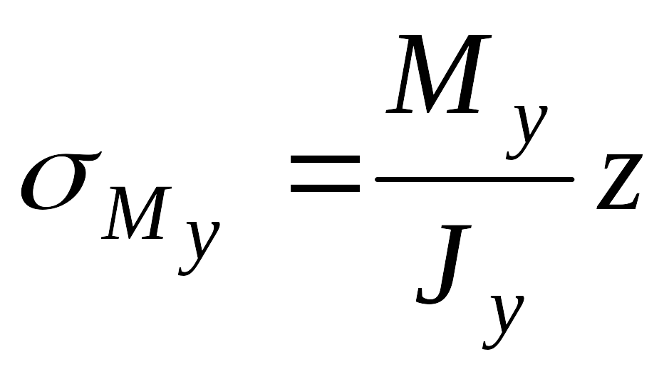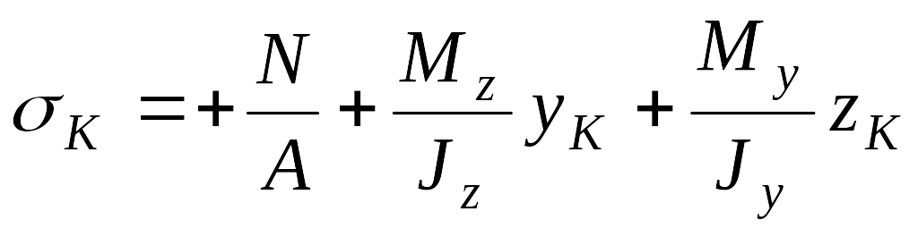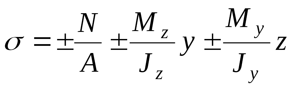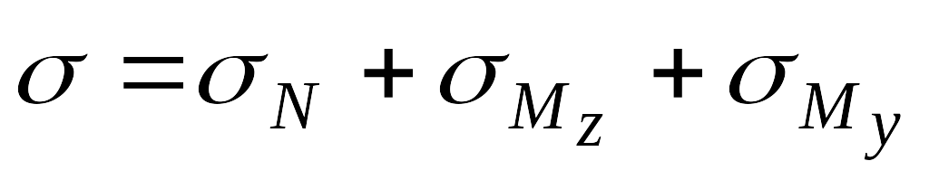 Каждый из приведенных внутренних силовых факторов является интегральной суммой нормальных напряжений, возникающих в продольных волокнах стержня. Напряженное состояние, которое при этом возникнет, будет линейным. Следовательно, для определения расчетного напряжения можно использовать принцип простого суммирования нормальных напряжений.