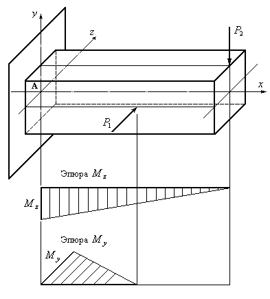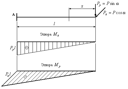 Так же, как и при пространственном изгибе, при косом изгибе отсутствует продольная сила. Влиянием поперечных сил при расчете балки на прочность будем пренебрегать.
